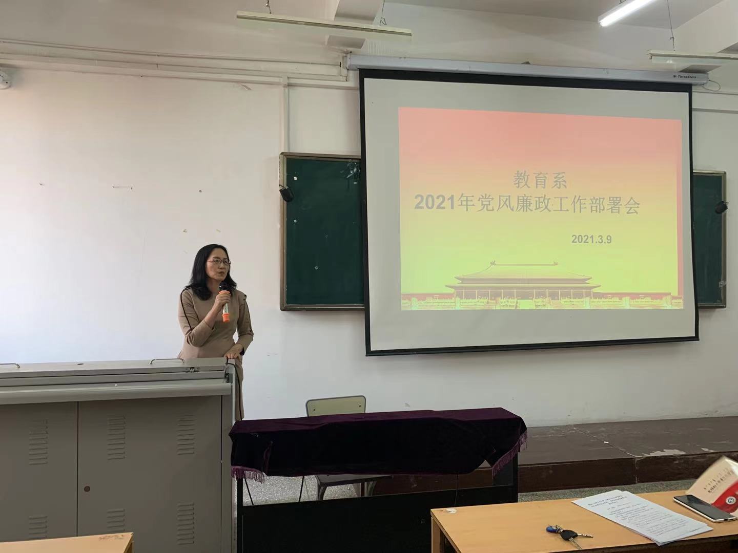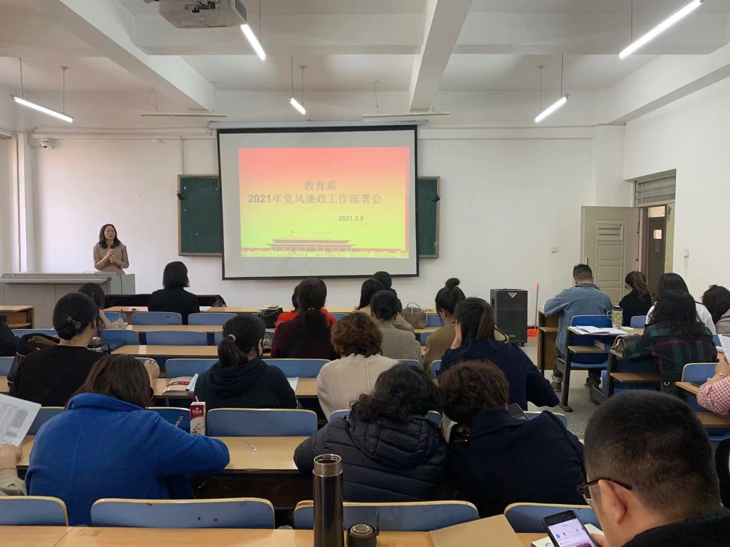 2021年3月9日下午,教育系党总支组织全体党员在创业楼308召开了教育系2021年党风廉政建设工作会。会议由党总支书记张健主持。
