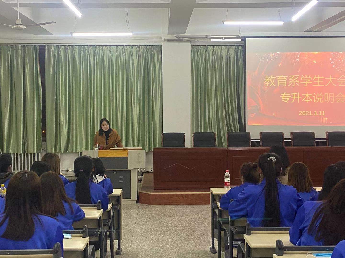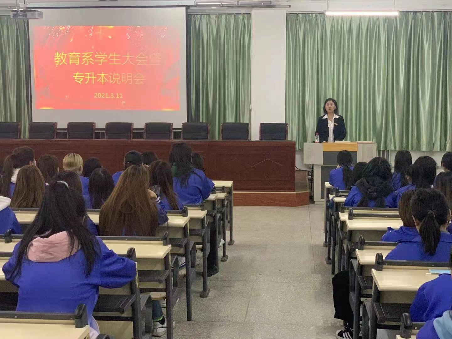 3月11日晚,教育系分四批次组织2019级学生召开了学生大会暨专升本说明会,两个会场分别由党总支书记张健和系主任侯俊杰主持。