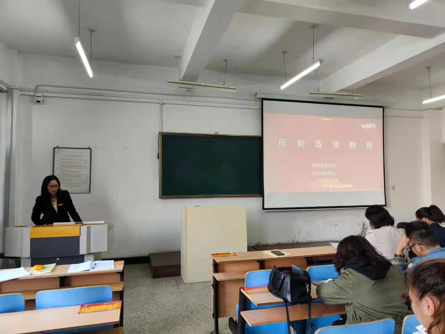 为进一步推动教育系全体教师学史明理、学史增信、学史崇德、学史力行,4月8日下午,系党总支组织全体教师在创业楼208开展形势政策教育之党史学习教育集中学习。会议由党总支书记张健主持,全体教师参加。