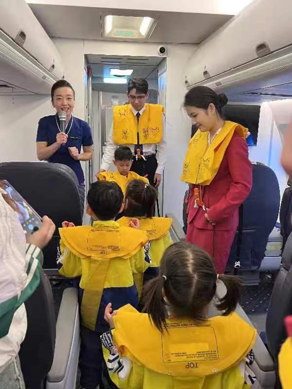 在老师们有序的组织下,小朋友们拿好登机牌,通过安检后激动的走进模拟舱。找到座位后,讲解员王丹老师为孩子们讲解了空乘的相关礼仪知识和飞机上的安全小知识,如:飞机上的紧急逃生出口在哪里?救生衣在什么位置?如何快速穿上救生衣?救生衣上的哨子是用来做什么的?并请每一位小朋友都体验穿救生衣的步骤。通过叠纸飞机,让小朋友们认识了飞机的构造。每位幼儿都在体验中获得了安全知识,在玩乐中体验到职业的意义。